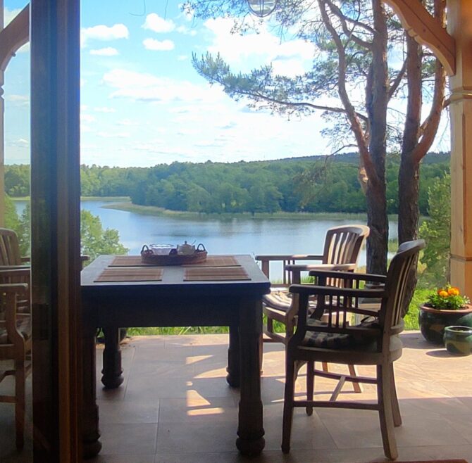 Komfortowy apartament na piętrze z tarasem i widokiem na jezioro, idealny dla par oraz osób szukających ciszy i prywatności.