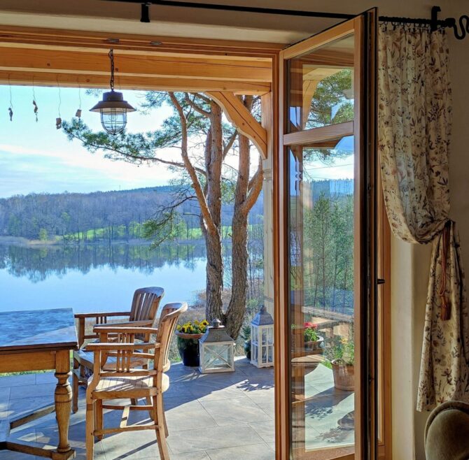 Prywatny dom z pełnym wyposażeniem, szybkim Wi-Fi, tarasami, dostępem do jeziora oraz strefą ogniska – wszystko w cenie pobytu.